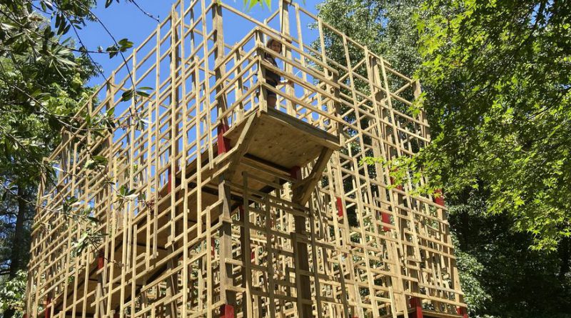 Entre las atracciones se encuentran El Atajo, una estructura de madera a la que se puede subir para mirar el horizonte. La obra de Luis Landet, que se vio en el Museo Marco de La Boca durante este año y que ahora es parte de Bienalsur. En el campo, una grilla que emula bastidores y fragmenta la vista de la naturaleza con esbozos de las esculto-pinturas que en realidad hacen referencia al paisaje.